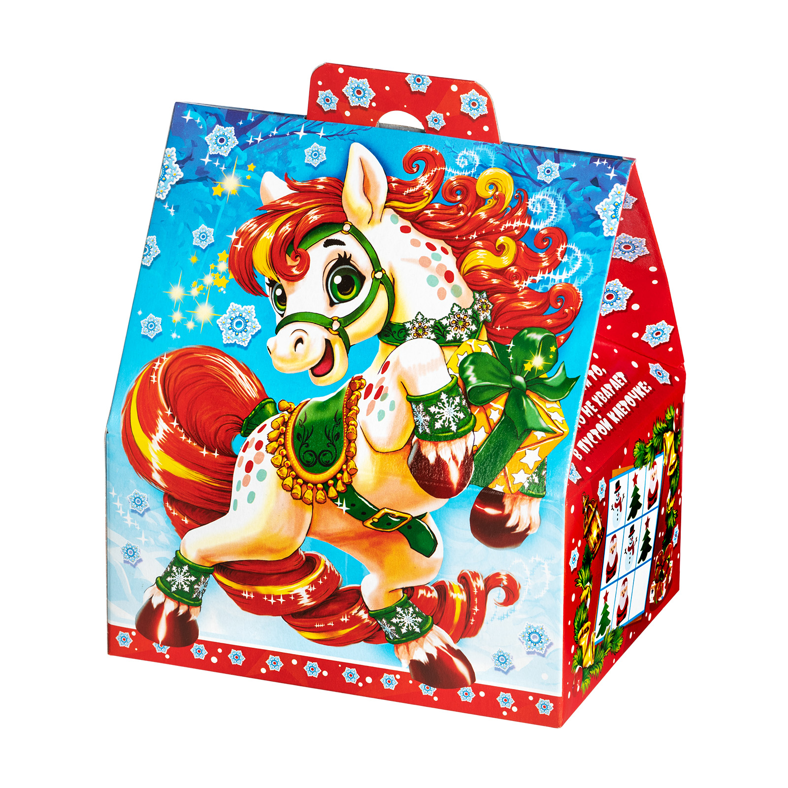 Новогодний сладкий подарок с изображением символа наступающего года - это беспроигрышный вариант под любое праздничное торжество. “Астра” -. это небольшая картонная коробочка с изображением веселой грациозной лошадки. Сверху имеется удобная прорезная ручка, а внутри этой коробки бережно хранятся вкусные и разнообразные сладости. Помимо угощений данный набор содержит небольшой памятный сувенир, а также сбоку есть мини-игра на внимательность и логику. Этот конфетный набор за счет компактных размеров и невысокой стоимости прекрасно подойдет для покупки в школы или детские сады - детки будут в восторге!